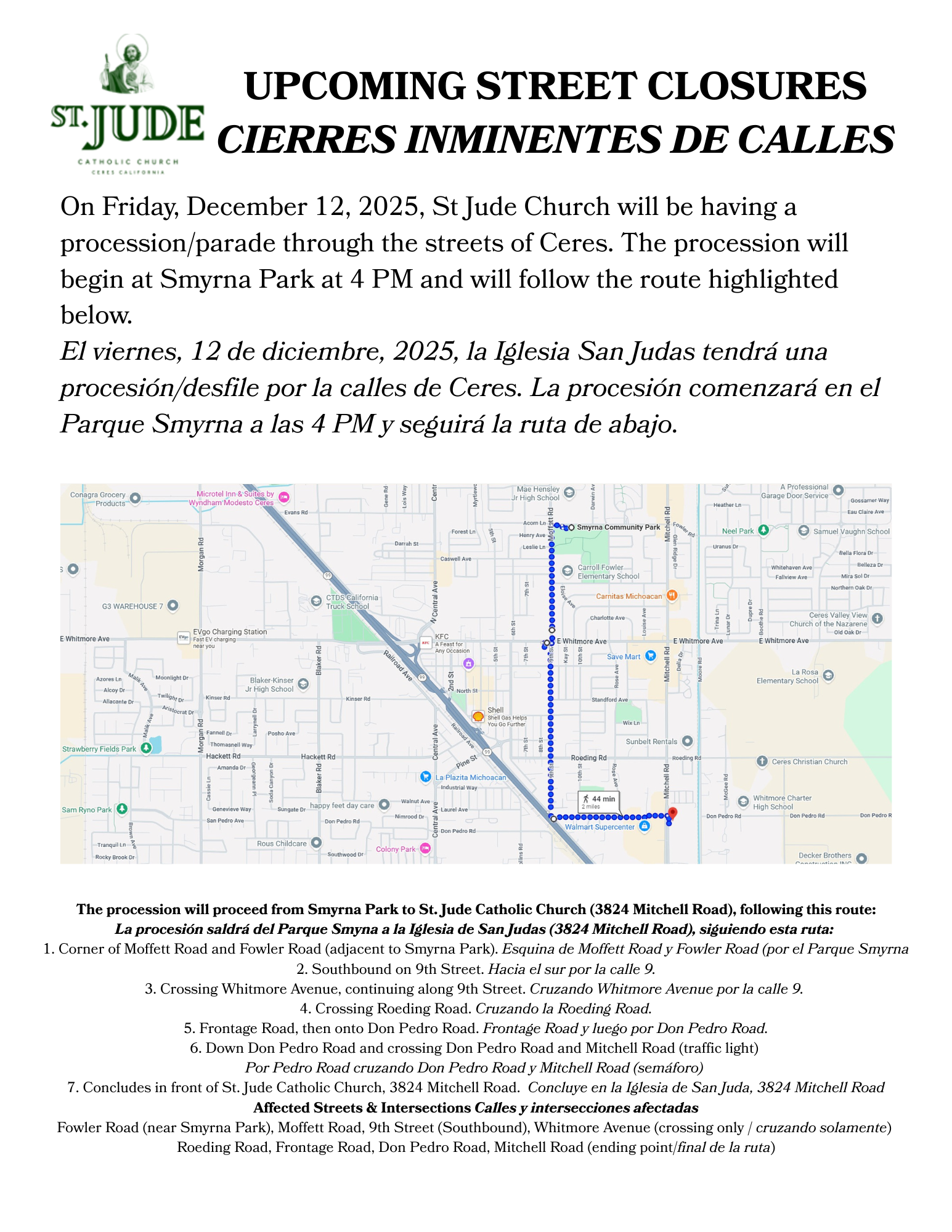 On Friday, December 12, 2025, St. Jude Catholic Church will be having a procession/parade through the streets of Ceres.